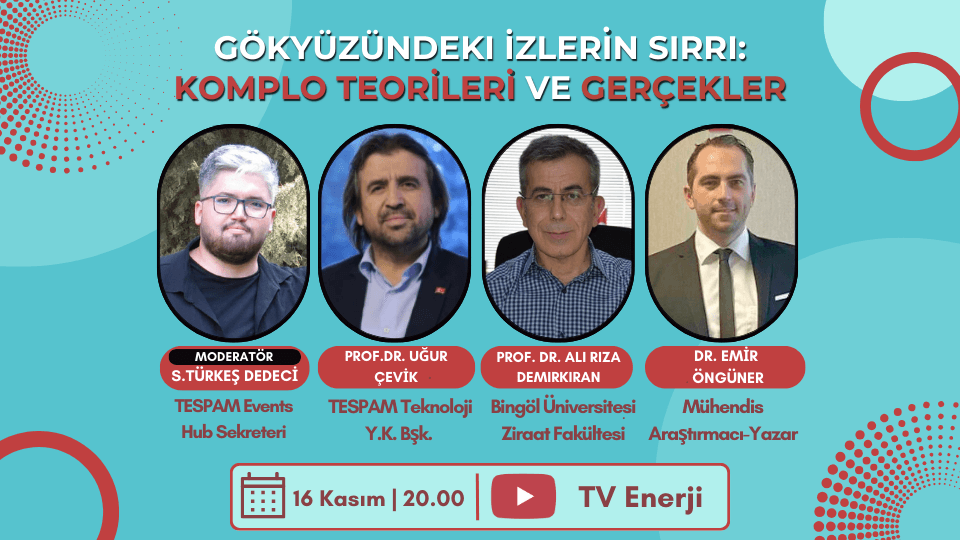 TESPAM tarafından gündemin nabzını tutacak online programa davetlisiniz. Diğer webinarlarımızdan farklı olarak, bu etkiliğimizde günümüzde çok fazla konuşulan ve komplo teorisi dahilinde değerlendirilen; spreyleme, yapay yağmur gibi konuları uzman konuklarımızla ele alacağız. Programımızı TESPAM’ın resmi youtube hesabı olan TVEnerji üzerinden izleyebilirsiniz. Moderatör: Süleyman Türkeş Dedeci Konuşmacılar: Prof. Dr. Ali Rıza Demirkıran Prof. Dr. Uğur Çevik Dr. Emir Öngüner